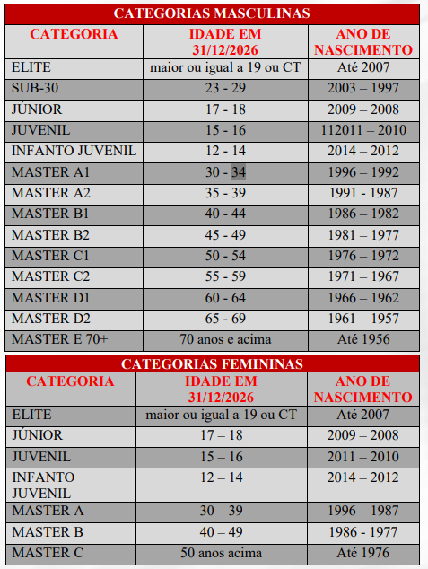 Sub-30 e Masters (A1,A2,B1,B2), Juvenil, Infanto Juvenil, Masters (C1,C2), Masters