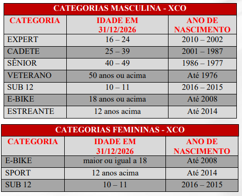 e-bikes (fem. e masc.), expert, cadete, sênior, veterano, estreante e sub-12 masculina.