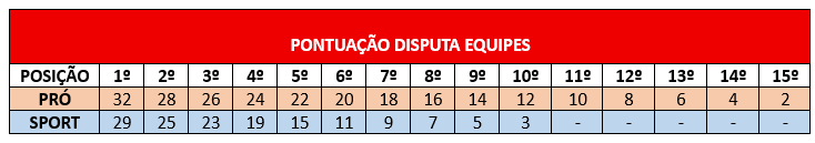 2) Ranking de Equipes será obtido do somatório de pontos dos atletas das equipes na etapa nas categorias PRO e SPORT, serão computados os 10 melhores resultados da equipe;