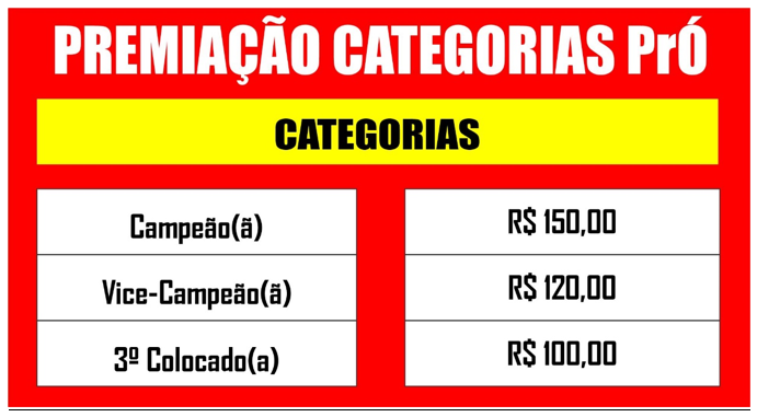 Premiação em dinheiro para as demais categorias PRO com o mínimo de 15 inscritos confirmados até 48 horas do evento: