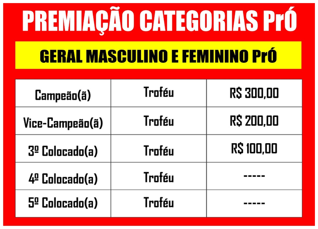 Premiação em dinheiro para os 5 primeiros Colocados GERAL PRO Masculino e Feminino.
