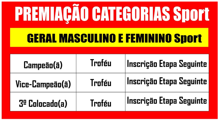 Serão premiados os 3(tres) primeiros colocados da GERAL SPORT MASCULINO e FEMININO com uma inscrição para a Próxima etapa.